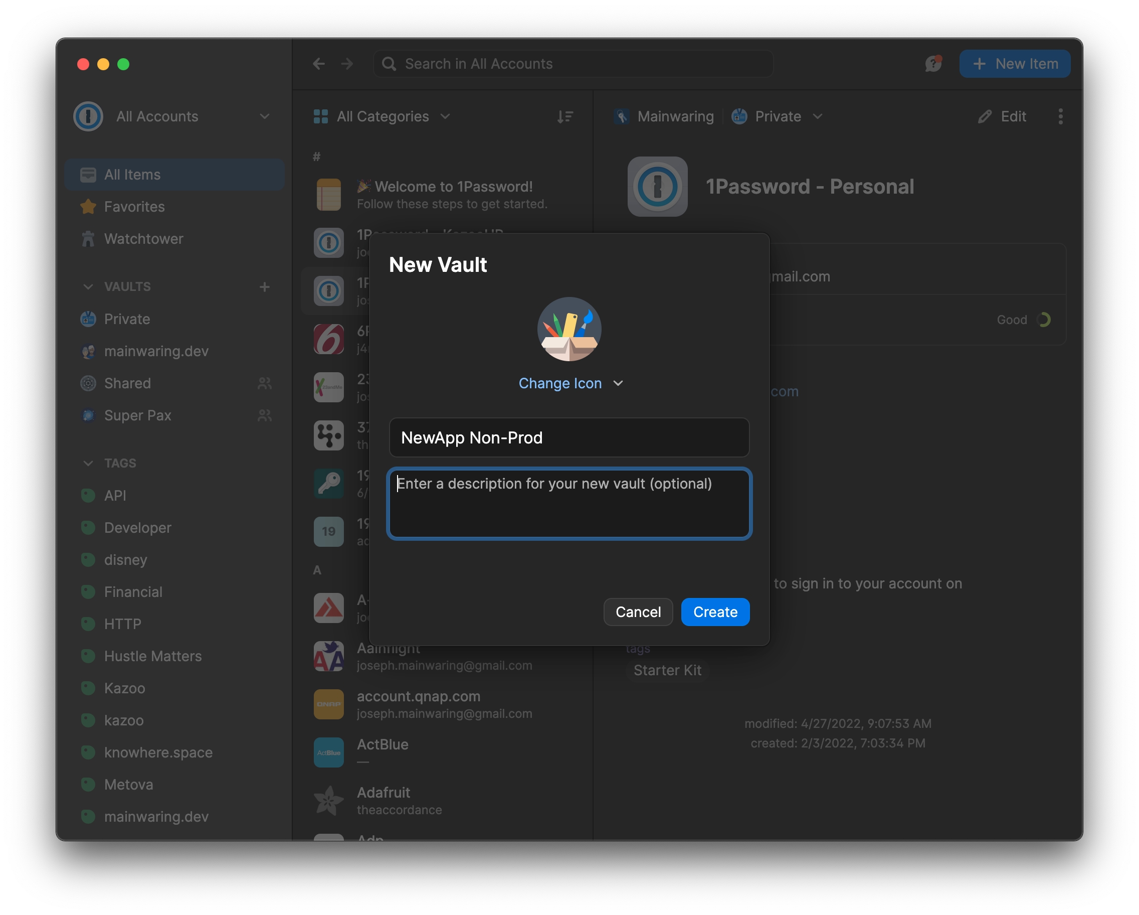 Given this context, we'd want our Junior Engineer to be able to view/add/edit non-production secrets, but not production ones. Let's start by first creating a vault which is accessible by all engineers and call it NewApp Non-Prod: