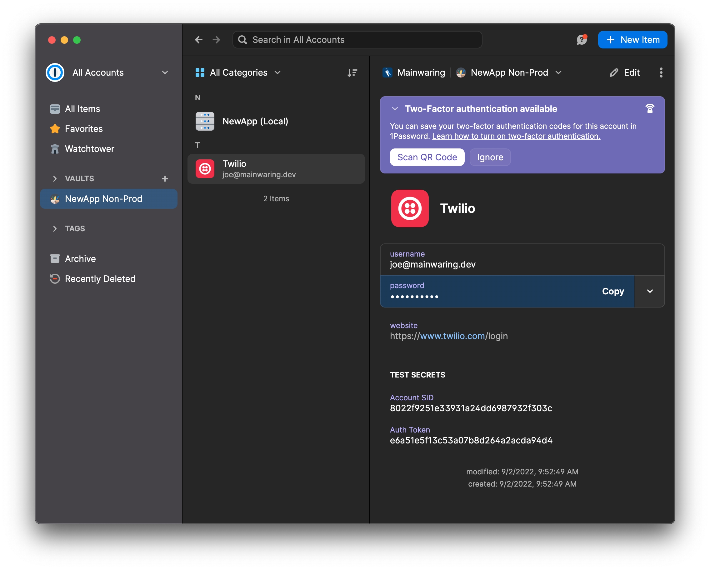 Next let's add a second item to our vault for a third-party integration. For this example, we'll use the service Twilio and define our test Account SID
